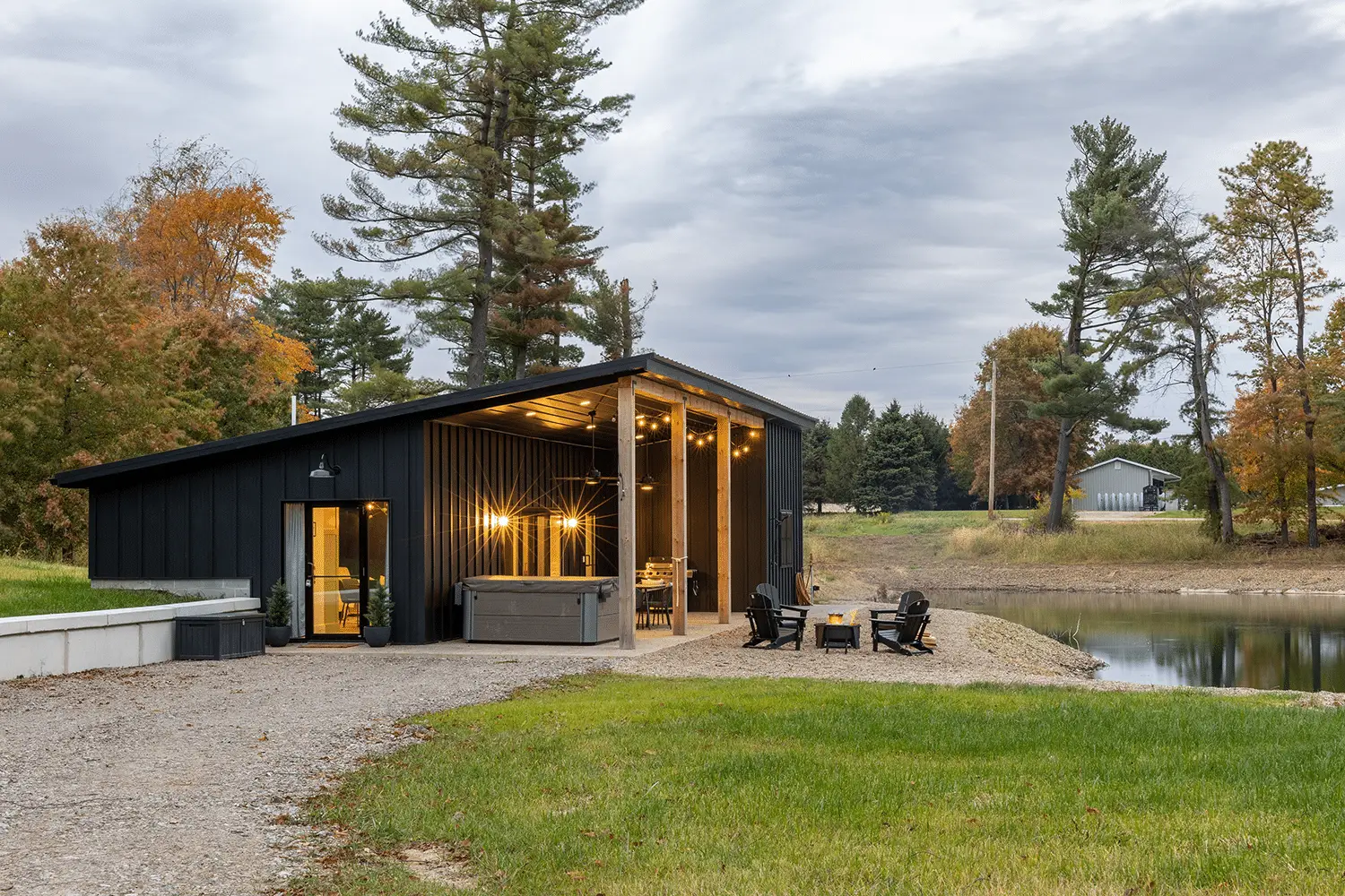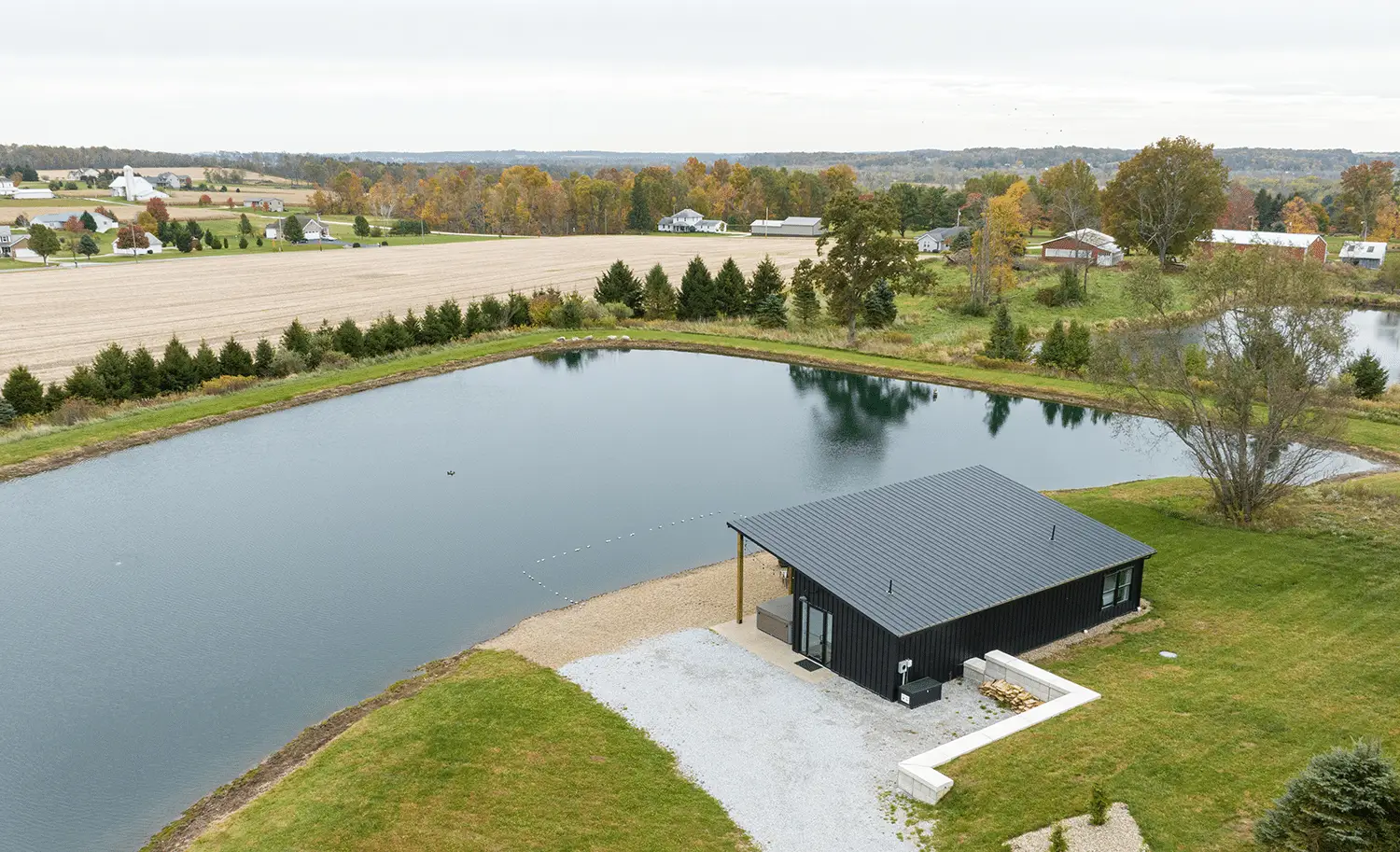 J Troyer topped off this stunning vacation spot–Whispering Pines Retreat in Jeromesville, OH– with black crinkle Aristolath. This 1,300-square-foot cabin sits on the shores of a beautiful pond.
