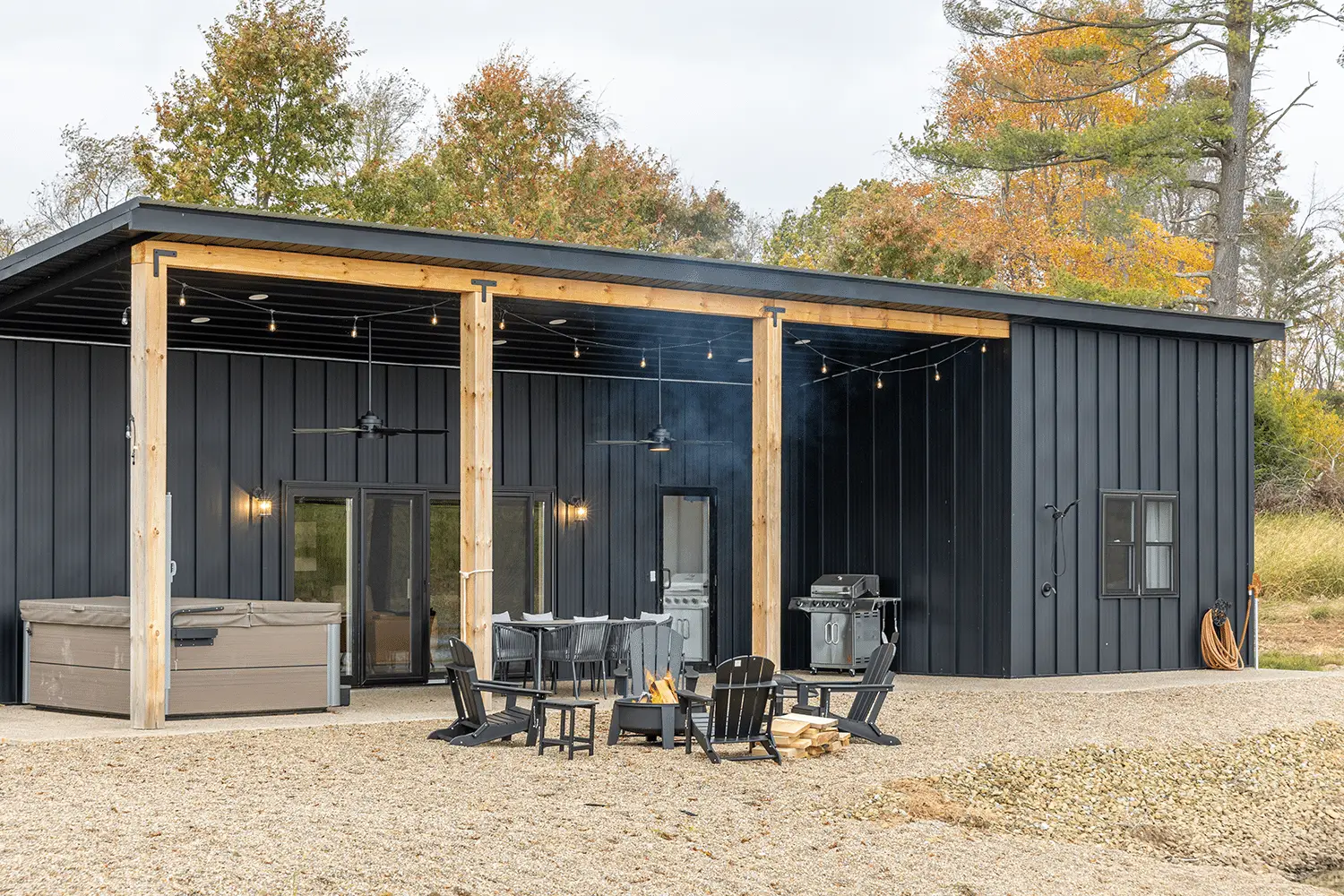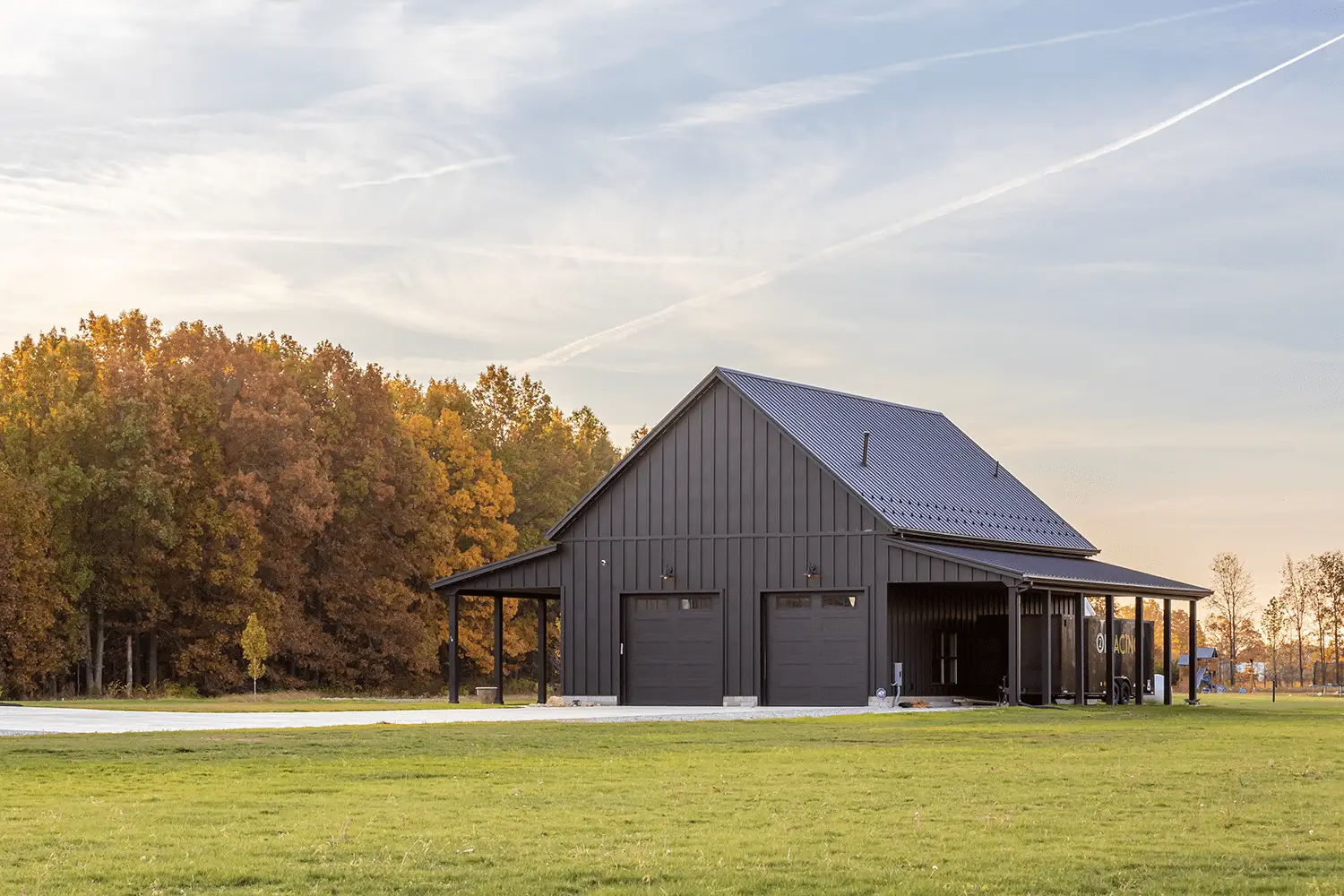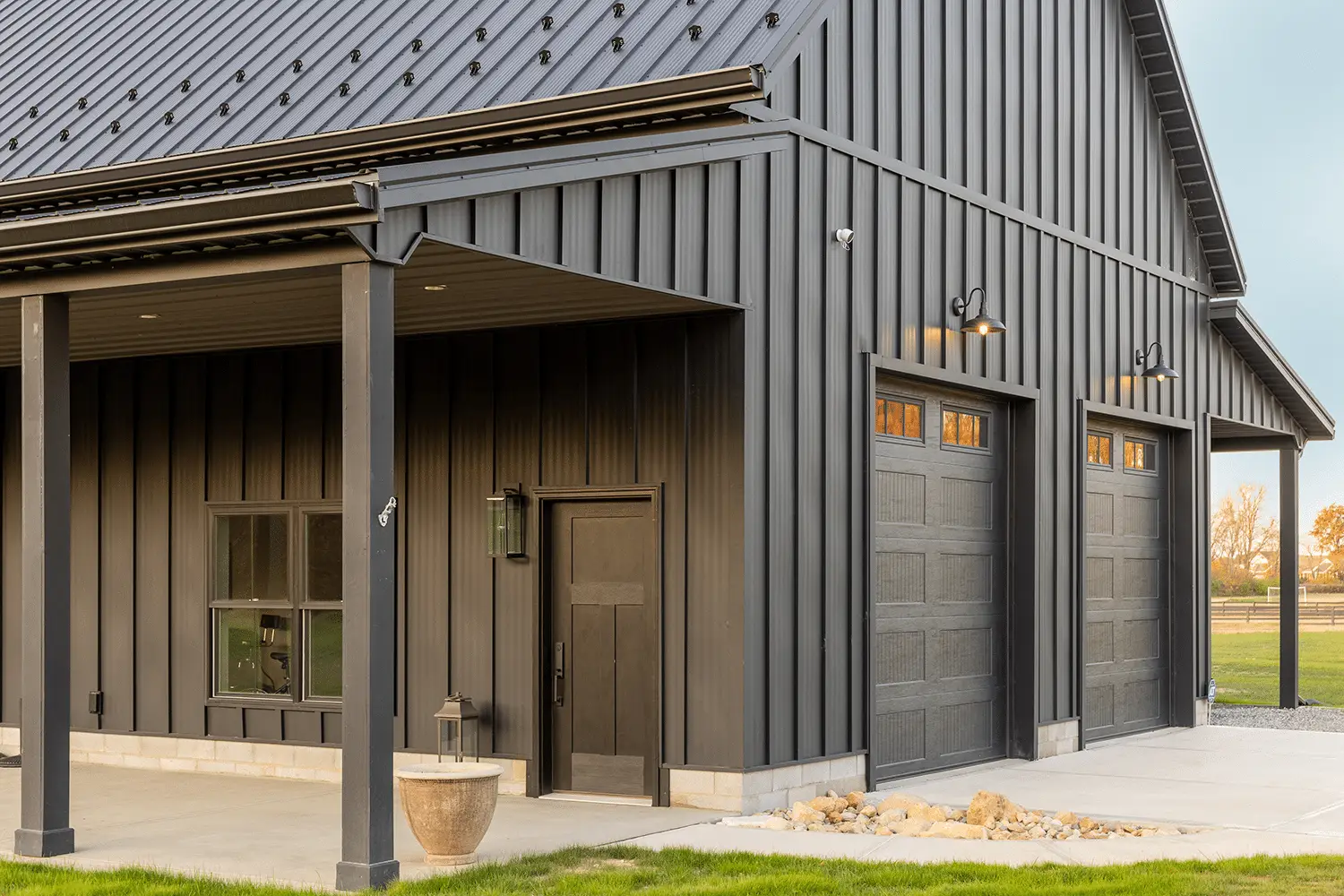 J Troyer Roofing also finished a pole barn in Delaware with black Aristolath siding. For both the pole barn and the retreat center, J Troyer Roofing used reverse J paneling. The slats are further apart (12” instead of 7”), giving the exterior a less crowded look. Around the windows, the trim fills it out, preventing any white from showing and ensuring a neat, refined look.